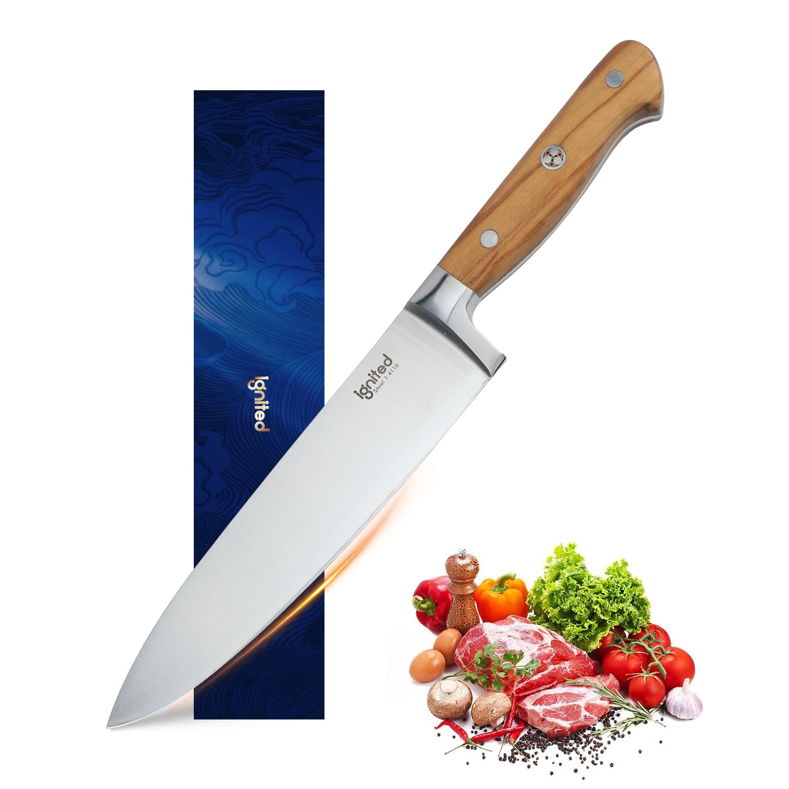 IGNITED CUTLERY 8" Western Chef Knife – German 1.4116 Steel, 15° V-Shaped Edge, Premium Natural Olivewood Handle, Ergonomic Design, No Sharpening Needed for a Year
