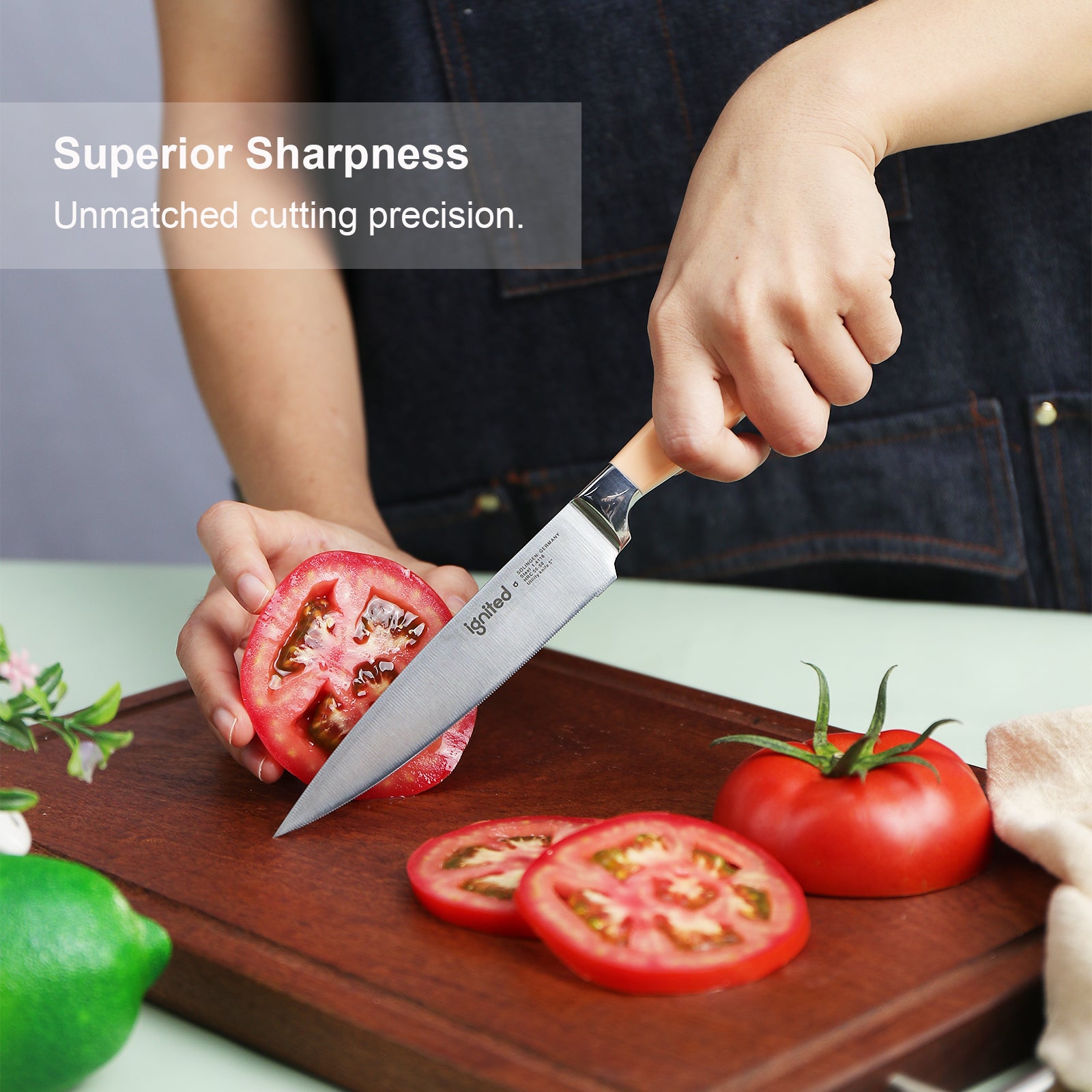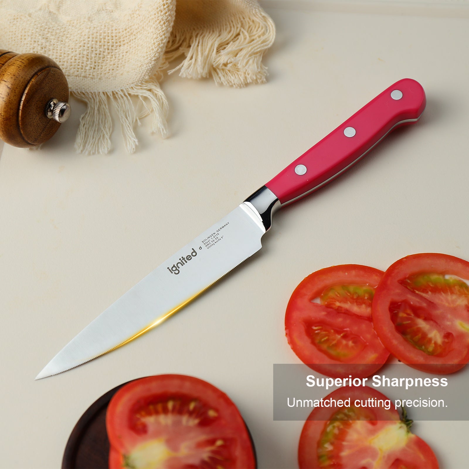 IGNITED CUTLERY 5" Tomato Knife – Serrated Edge, German 1.4116 Stainless Steel, Ergonomic Dopamine-Colored ABS Handle, Multi-Purpose Peeler