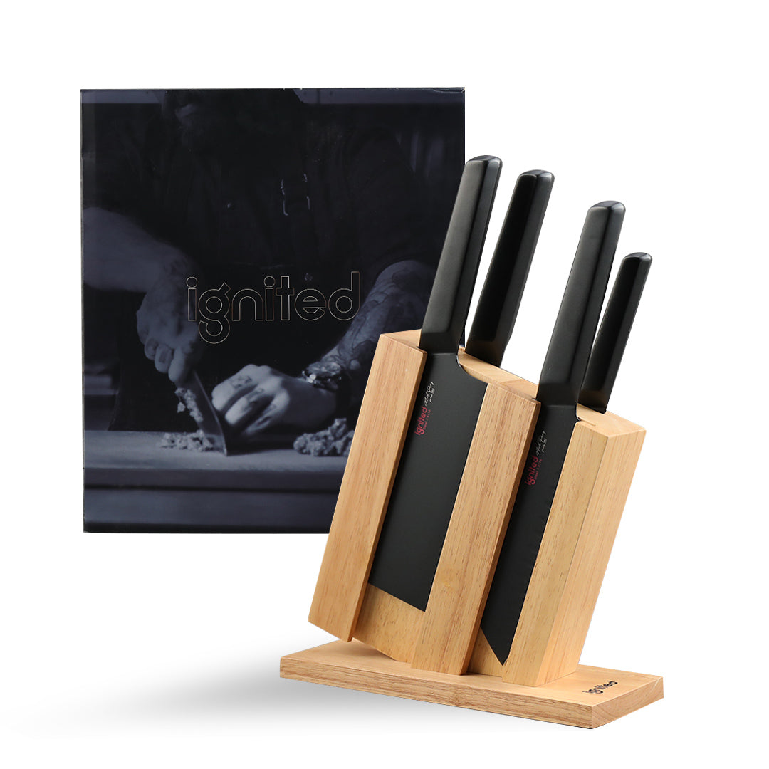 IGNITED CUTLERY 5-Piece Kitchen Knife Set with Block – German 1.4116 Steel, BO Antibacterial Coating, Includes Chef’s Knife, Santoku, Utility, Cleaver & Wooden Stand