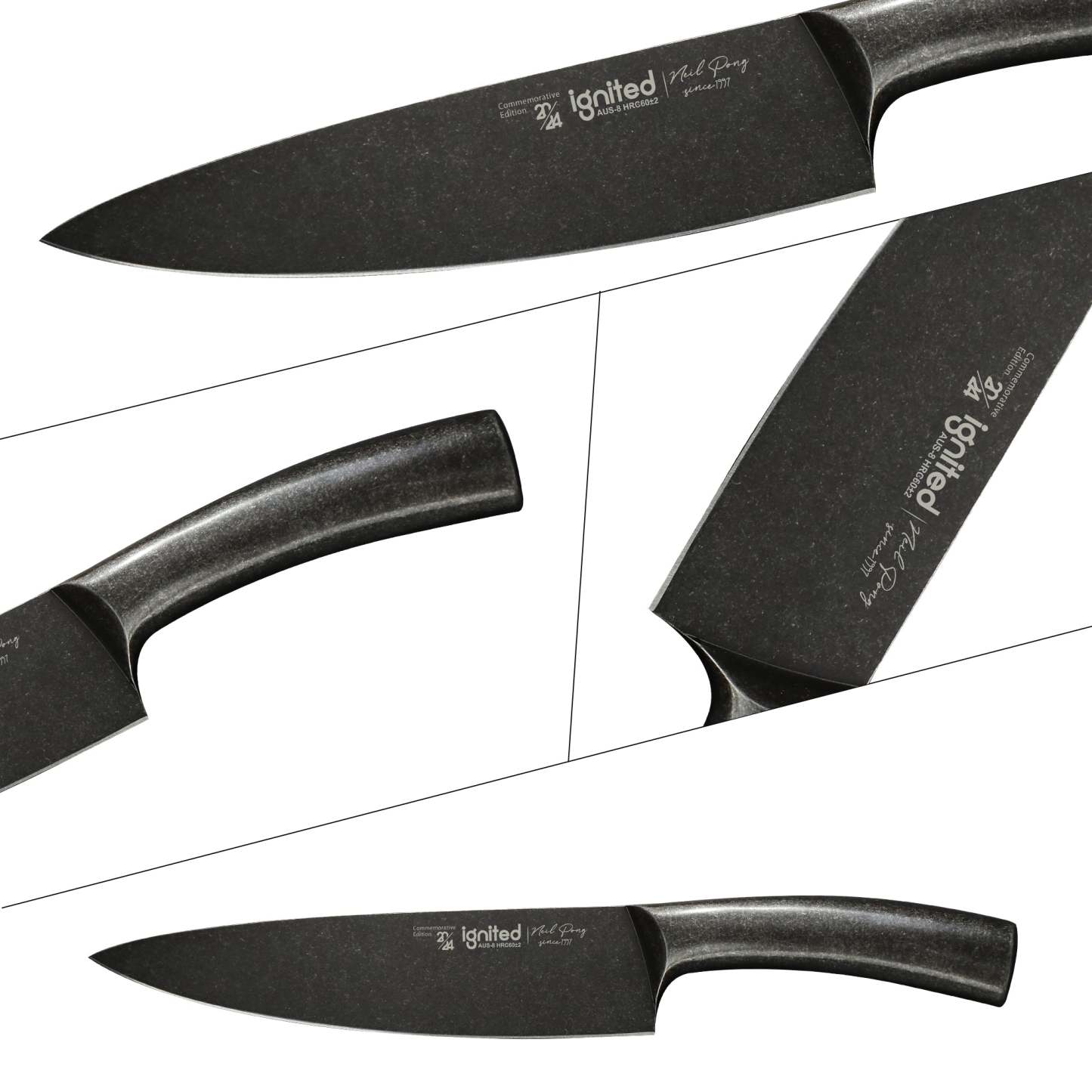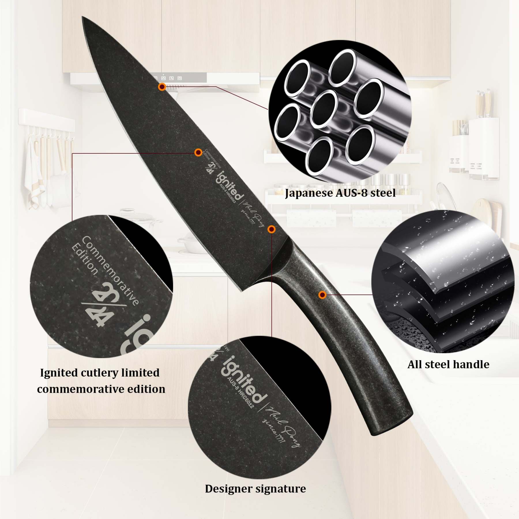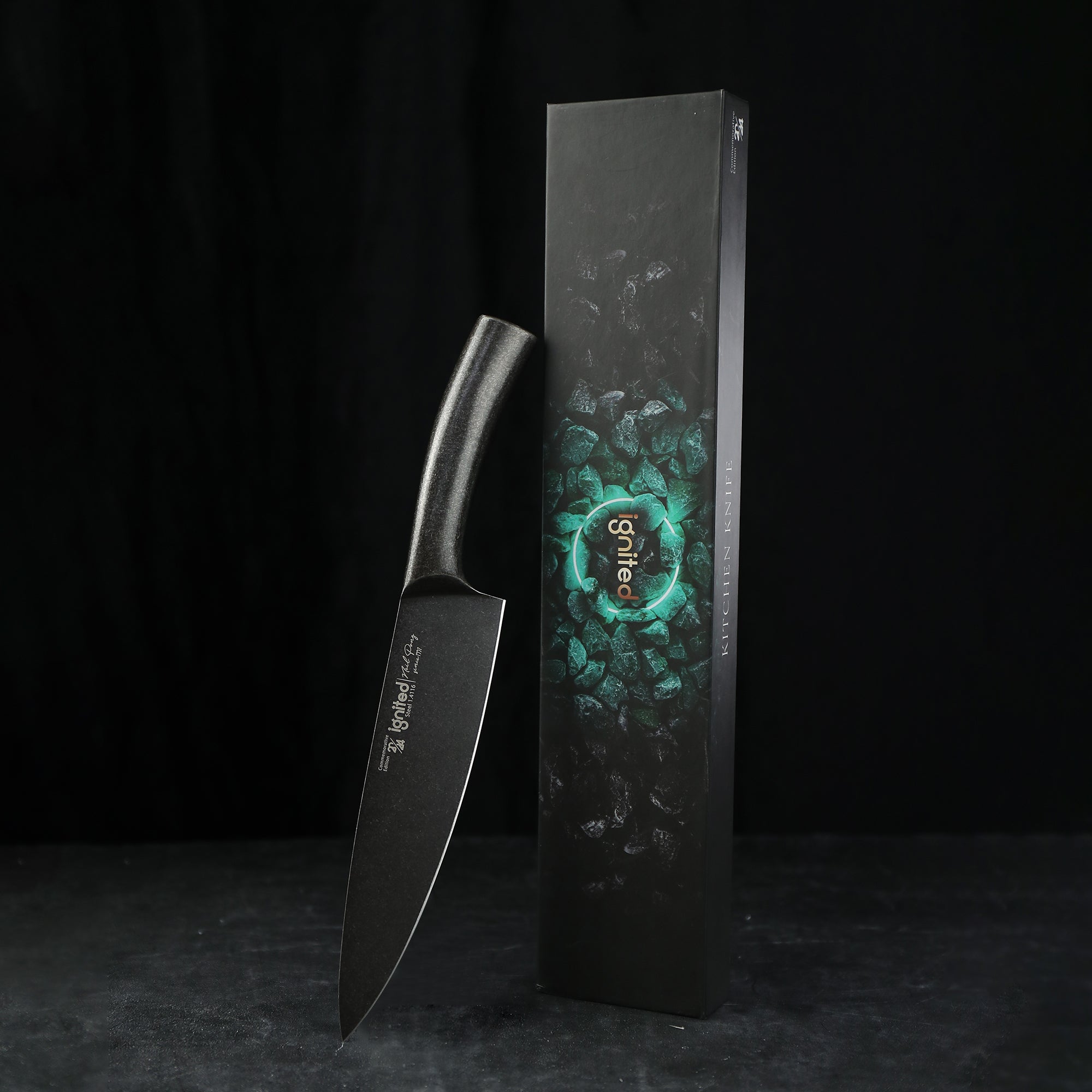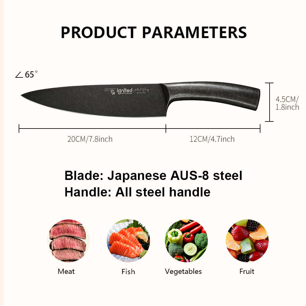 IGNITED CUTLERY 8" Limited Edition Chef Knife – One-Piece All-Steel AUS-8 Knife, 13° Razor Edge, Ergonomic Steel Handle, Stonewashed Finish
