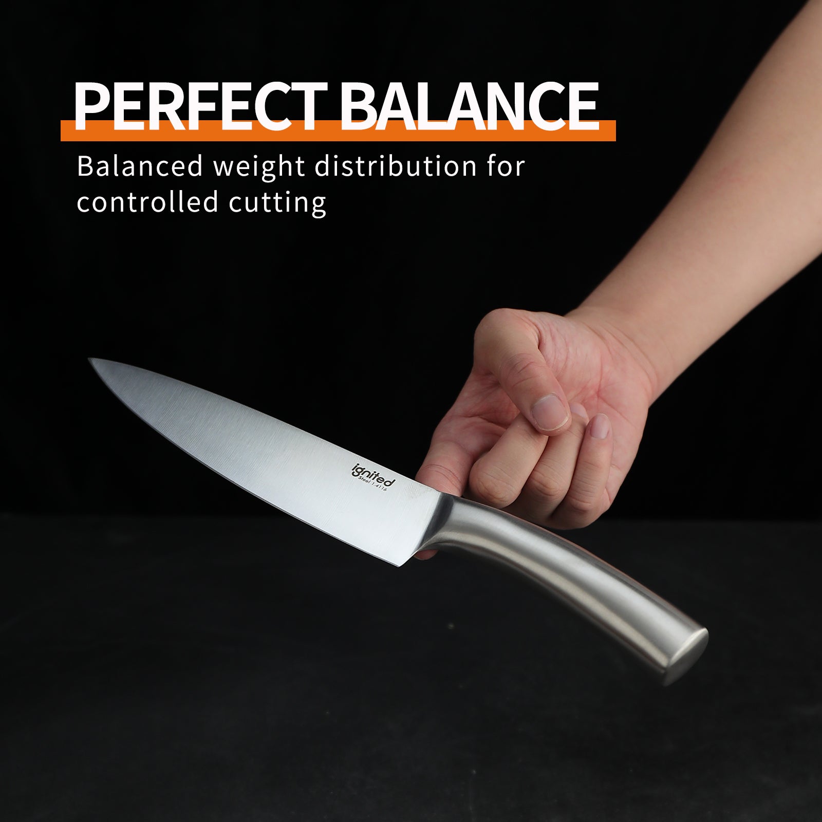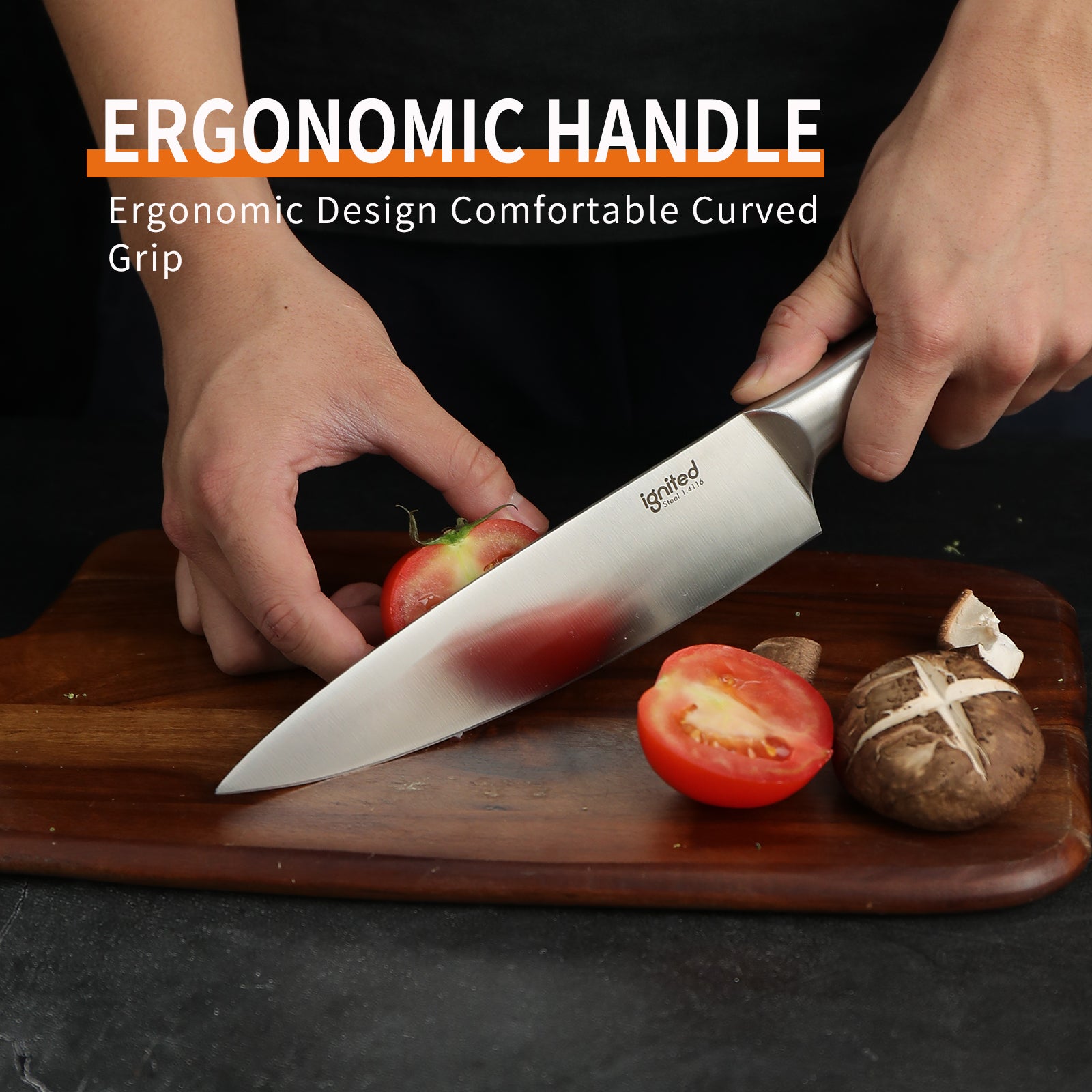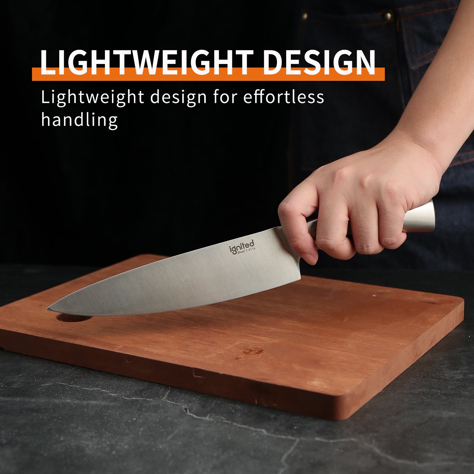 IGNITED CUTLERY 8" Ultra-Thin Full Steel Chef Knife – German 1.4116 Steel, 13° V-Shaped Edge, One-Piece Forged, Curved Ergonomic Handle, 58 HRC