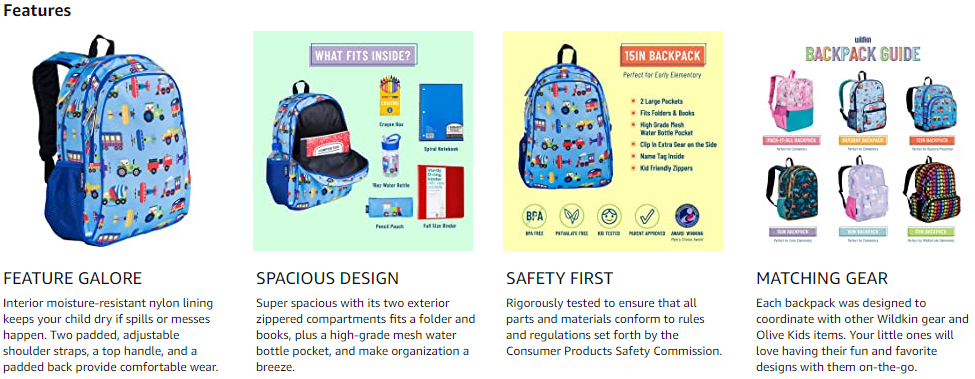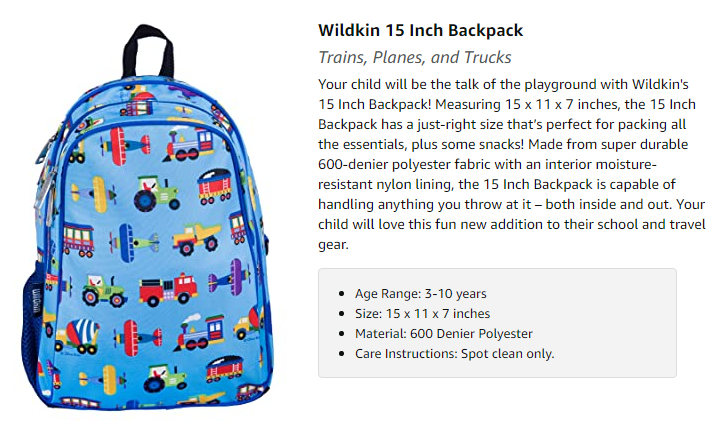 PATTERN COORDINATES WITH OTHER WILDKIN AND OLIVE KIDS ITEMS – Make a theme out of it! This school bag is part of our Olive Kids collection. Each 15 Inch boys and girls backpack was designed to coordinate with other Wildkin gears and Olive Kids items. From lunch boxes to duffel bags, your child will love having their favorite backpack with them on the go.