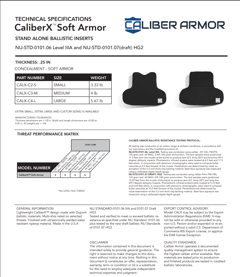 Caliber Armor manufactures their CaliberX™ Soft Armor line of body armor inserts from the very best para-aramid materials on the market. They are bullet resistant and waterproof. They have created an affordable soft armor system that meets the gold standard of 1 lb. per sq. ft. areal density.
