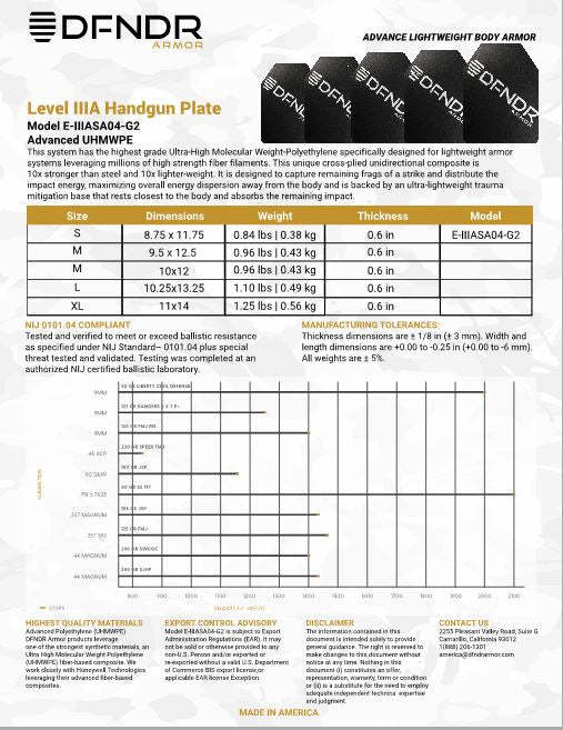 Upgrade your plate carrier loadout or bulletproof vest with the DFNDR Armor Level IIIA handgun plate -- lightweight at 0.96 lbs per medium size only.